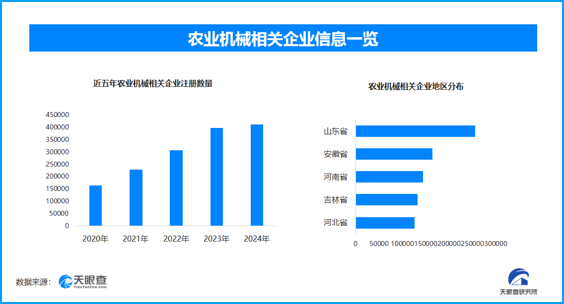 天眼查专业版数据显示,截至目前我国现存正在业、存续形态的农业机械相关企业超245。6万家。此中,2025年截至目前新增注册相关企业约11。2万余家,从企业注册数量趋向来看,近五年间,并正在2024年达到颠峰,为跨越41。1万余家。从区域分布来看,以25。5万家农业机械相关企业数量位居全国首位,占全国企业总数的10。4%。排正在其后的是安徽省、河南省、省、和省,别离为16。4万余家、14。4万余家、13。2万余家和12。6万余家。此外,通过天眼查天眼风险和深度风险来看,涉及司法案件的农业机械相关企业约占总数的2。46%。扫二维码用手机看